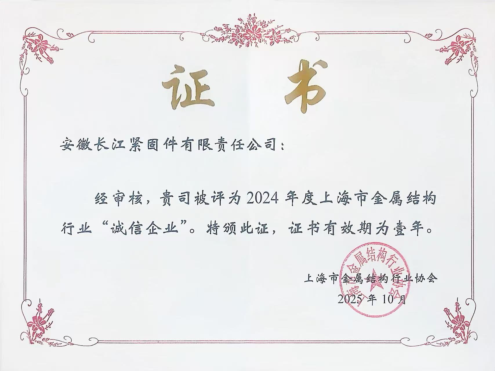 長江緊固件,作為國內高強度緊固件領域的標桿企業,我們一直秉持“質量為本、服務至臻、信譽為魂”的服務精神。此次再度獲評誠信企業,不僅是對長緊過去一年在合規經營、契約精神、質量管控及客戶服務等方面持續堅守的權威認證,更是對其長期塑造并維護良好市場聲譽的再度嘉獎。